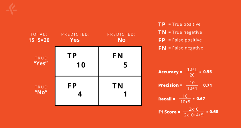 Recall, with respect to the class “yes” tells us out of all the “yes” class present, what fraction we predicted correctly. The F1 score is a harmonic mean of these two.